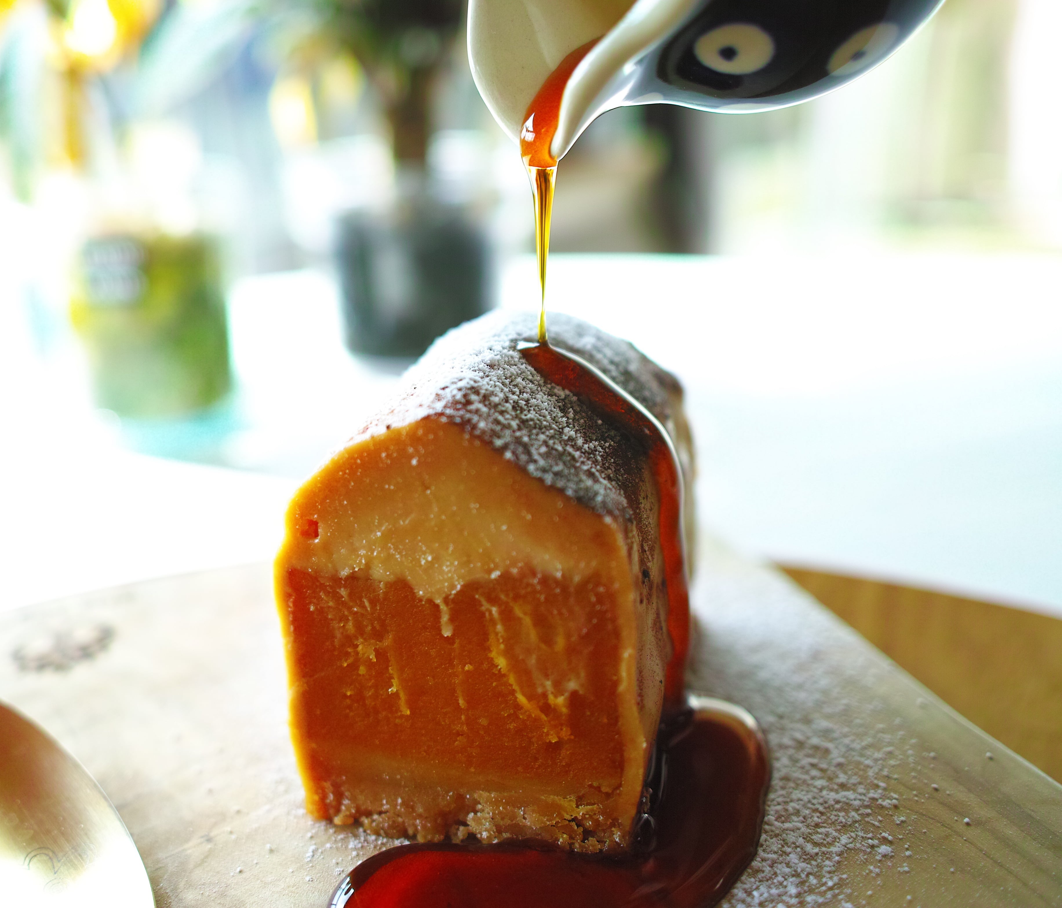 季節により選び抜かれた栗かぼちゃと、それを引き出すための厳選素材、製法により、複雑でありながらクリーンで後味の良いパンプキンショコラをお楽しみ頂けます。第四のチョコレートと言われるブロンドチョコレートを贅沢に使った上部のガナッシュに、かぼちゃケーキの中央部、サクサクとした食感が心地よい全粒粉使用タルト部、小瓶に入ったオーガニックのマスコバド糖と三温糖を使用したカラメルソースはお好みで、それぞれが一体化しながらも様々な食感と味わいを楽しめます。丸ごと生チョコのような濃厚なケーキとなっています